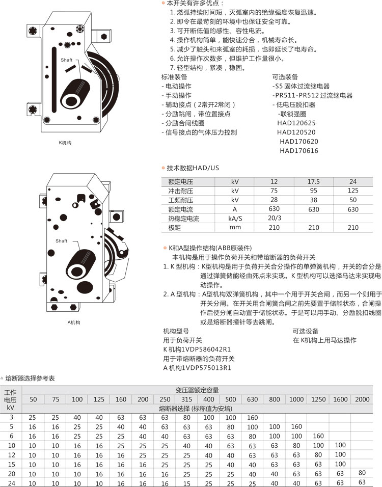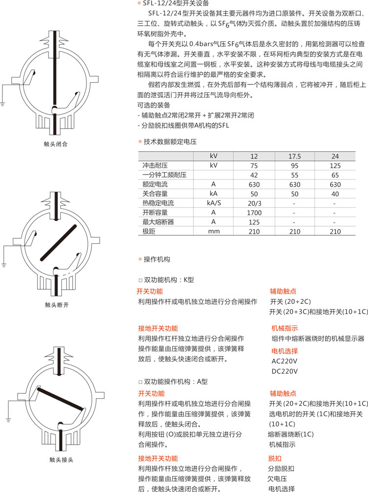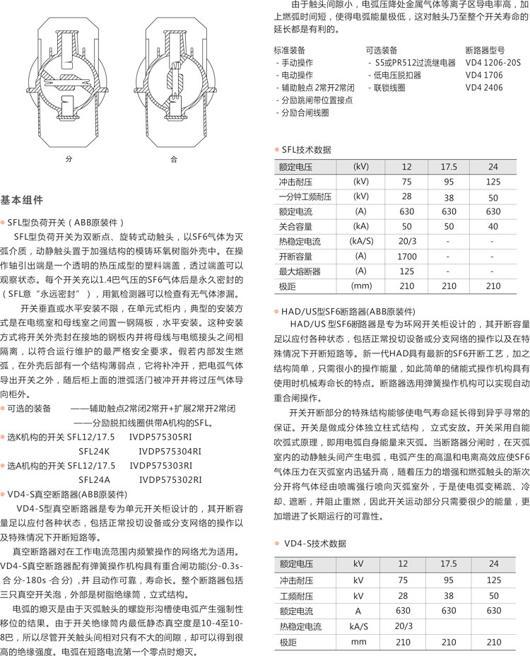 環(huán)網(wǎng)柜的主開關(guān)、操作機(jī)構(gòu)及元器件采用ABB公司原裝件或采用進(jìn)口部件國內(nèi)組裝生產(chǎn)的SFL-12/24型 開關(guān)設(shè)備,也可根據(jù)用戶需要配裝ABB公司原裝HAD/US型SF6。斷路器或VD4-S型真空斷路器,其操作方式分為手動、電動兩種。
