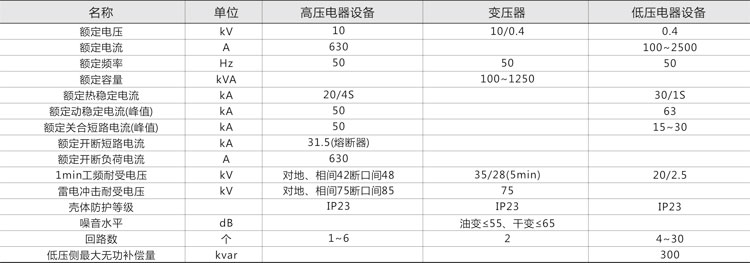 1. 本產(chǎn)品由高壓配電裝置、變壓器及低壓配電裝置聯(lián)接而成,分成三個功能隔室,即高壓室、變壓器室和低壓室,高、低壓室功能齊全,高壓側(cè)一次供電系統(tǒng),可布置成環(huán)網(wǎng)供電、終端供電、雙電源供電等多種供電方式,還可裝設(shè)高壓計量元件,滿足高壓計量的需求。變壓器室可選擇S9、SC以及其他系列低損耗油浸式變壓器或干式變壓器;低壓室根據(jù)用戶要求可采用面板或柜裝式結(jié)構(gòu)組成用戶所需供電方案,有動力配電、照明配電、無功功率補償、電能計量和電量測量等多種功能,滿足用戶的不同要求。并方便用戶的供電管理和提高供電質(zhì)量。