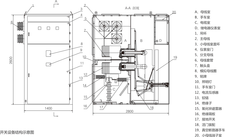 本開關(guān)設(shè)備具有電纜進出線、架空進出線、母線聯(lián)絡(luò)、隔離、電壓互感器、避雷器等主電路方案。母線采用復(fù)合絕緣,相間及連接頭配有用阻燃材料注塑而成的絕緣套,主母線相鄰柜間用母線套管隔開,能有效地防止事故蔓延,同時對主母線起到輔助支撐作用。電纜室裝有接地開關(guān)、過電壓保護裝置等。
